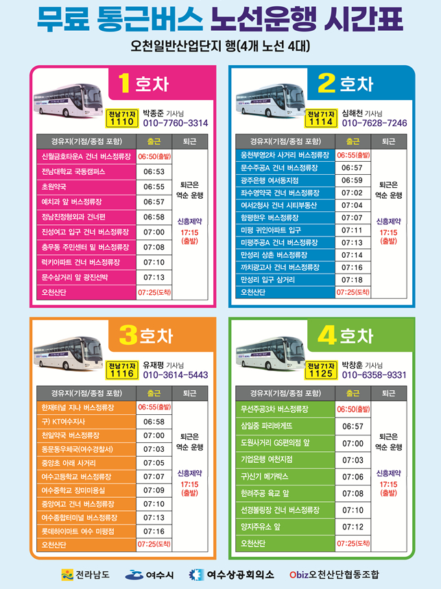 2026년도 여수오천산업단지 근로자 통근버스 운행 노선 및 시간표를 아래와 같이 안내드리오니 이용에 참고하시기 바랍니다.