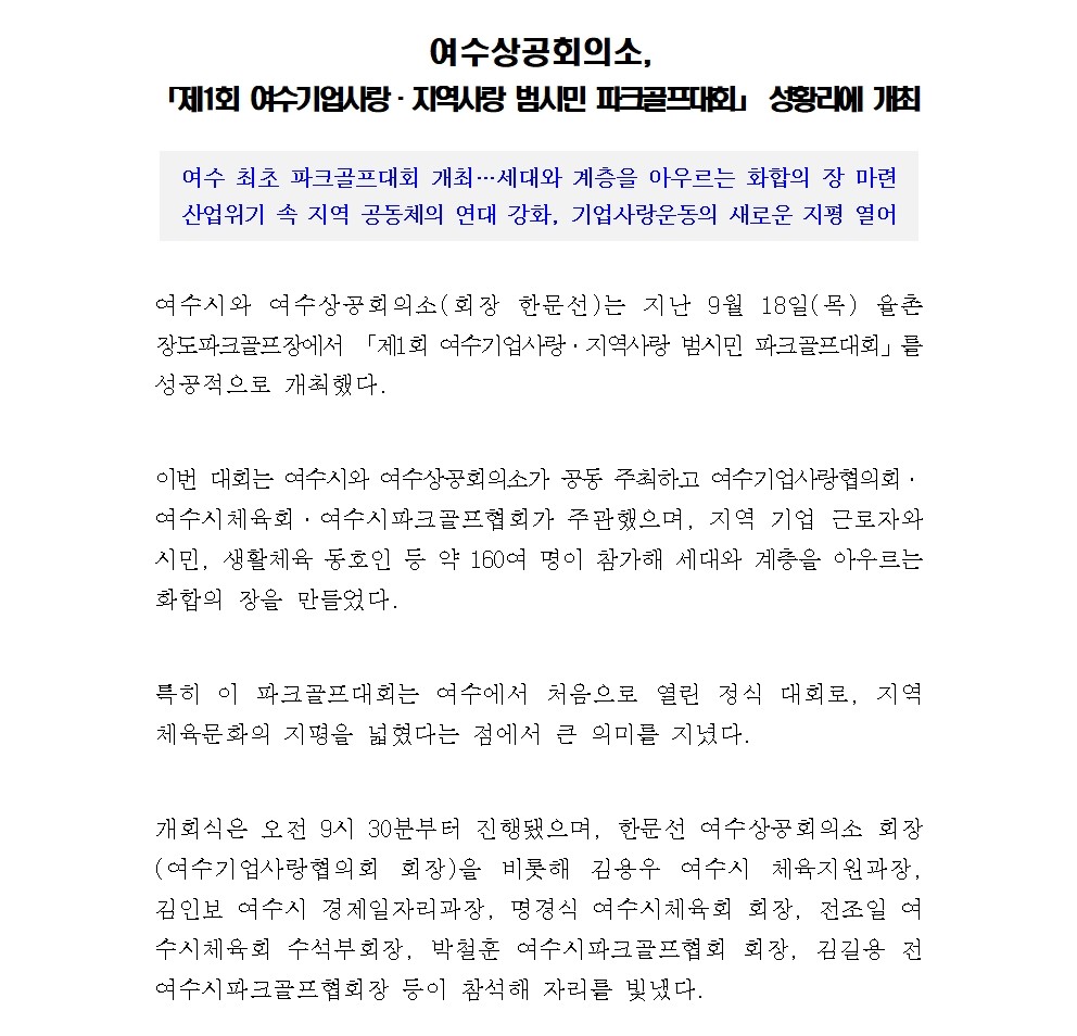 | ‒ | 여수상공회의소 「제1회 여수기업사랑·지역사랑 범시민 파크골프 대회 성황리에 개최 |
