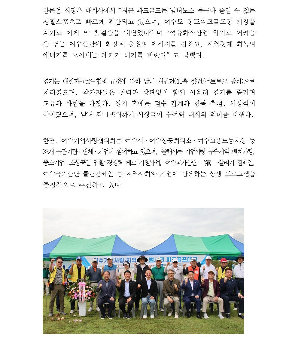 | 제목 | 여수상공회의소 「제1회 여수기업사랑·지역사랑 범시민 파크골프 대회 성황리에 개최 | ||
