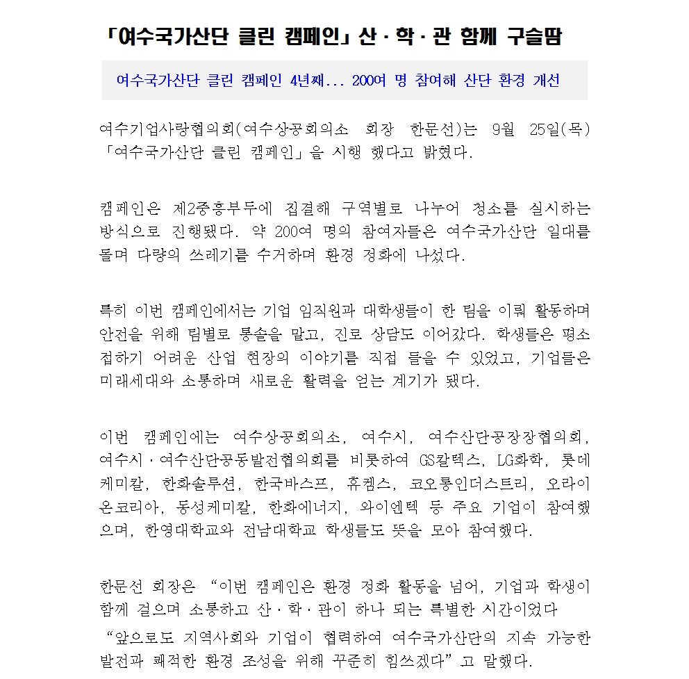 | 제목 | 「여수국가산단 클린 캠페인」산·학·관 함께 구슬땀 | ||