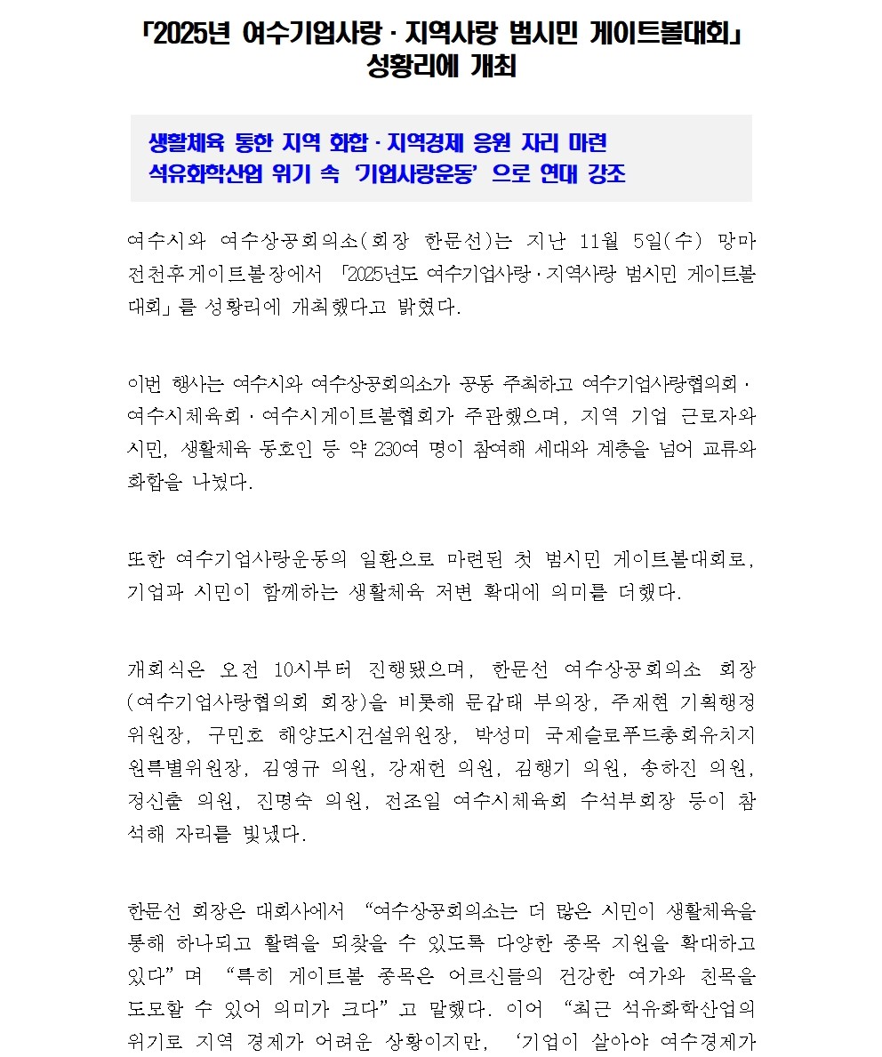 | 제목 | 2025년 여수기업사랑·지역사랑 범시민 게이트볼 대회 성황리 개최 | ||