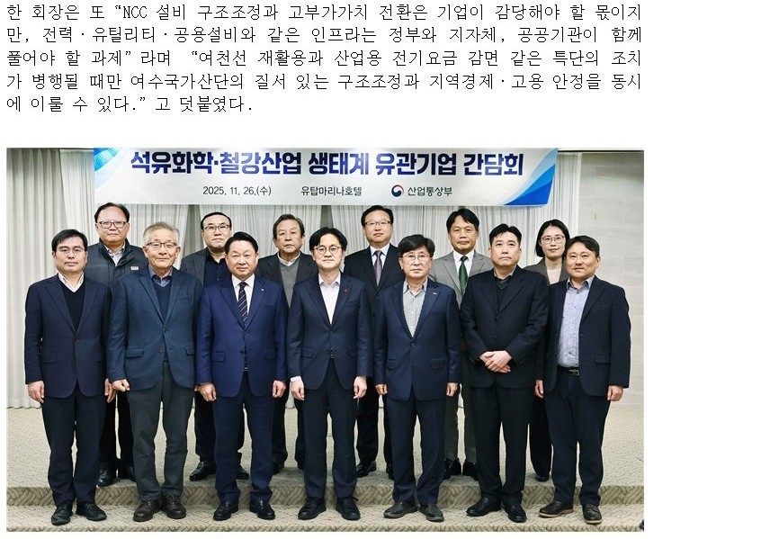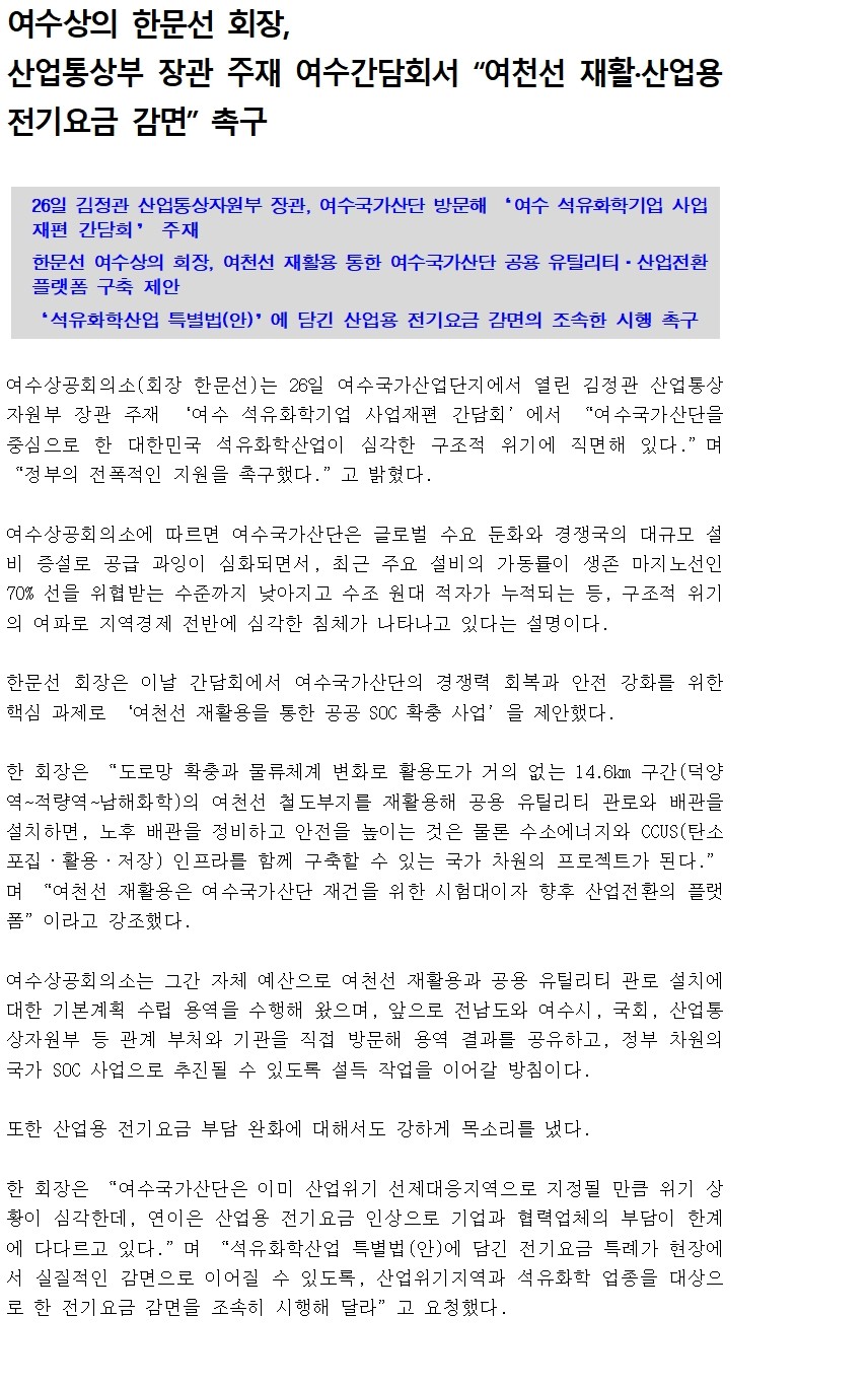 | 제목 | 여수상의, 산업통상부 장관 주재 여수간담회서 “여천선 재활·산업용 전기요금 감면” 촉구 | ||