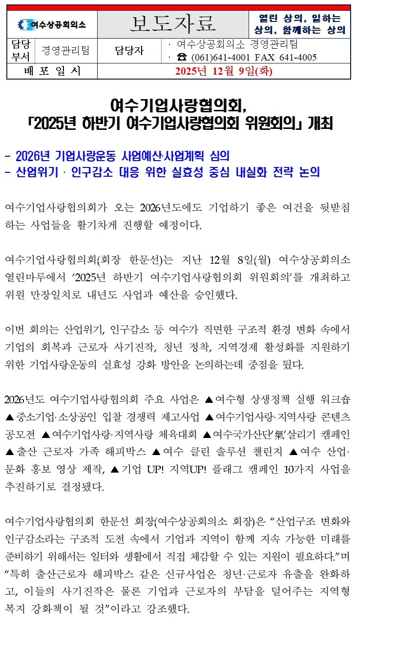 | ‒ | 여수상의, 2025년 하반기 여수기업사랑협의회 위원회의 개최 |