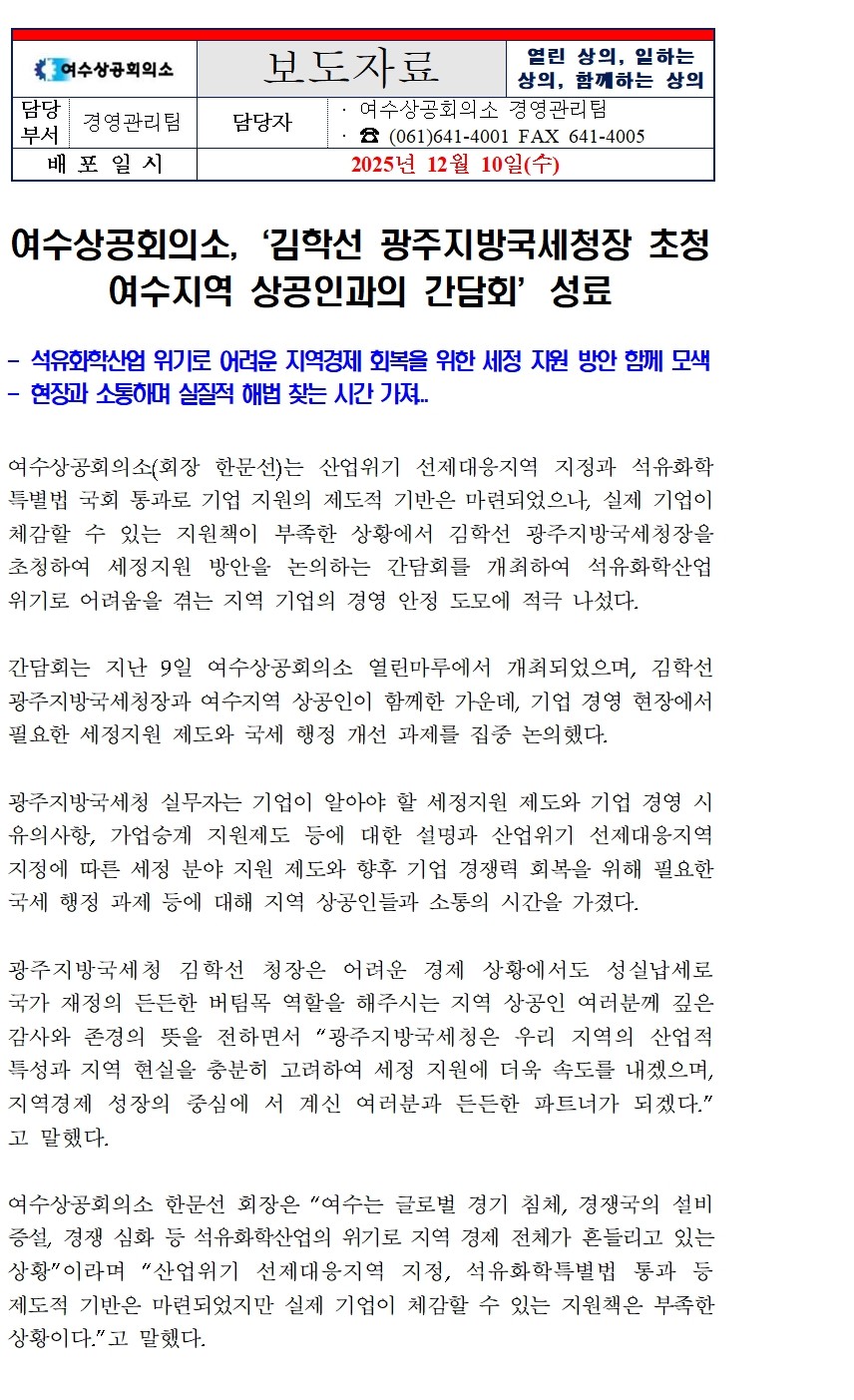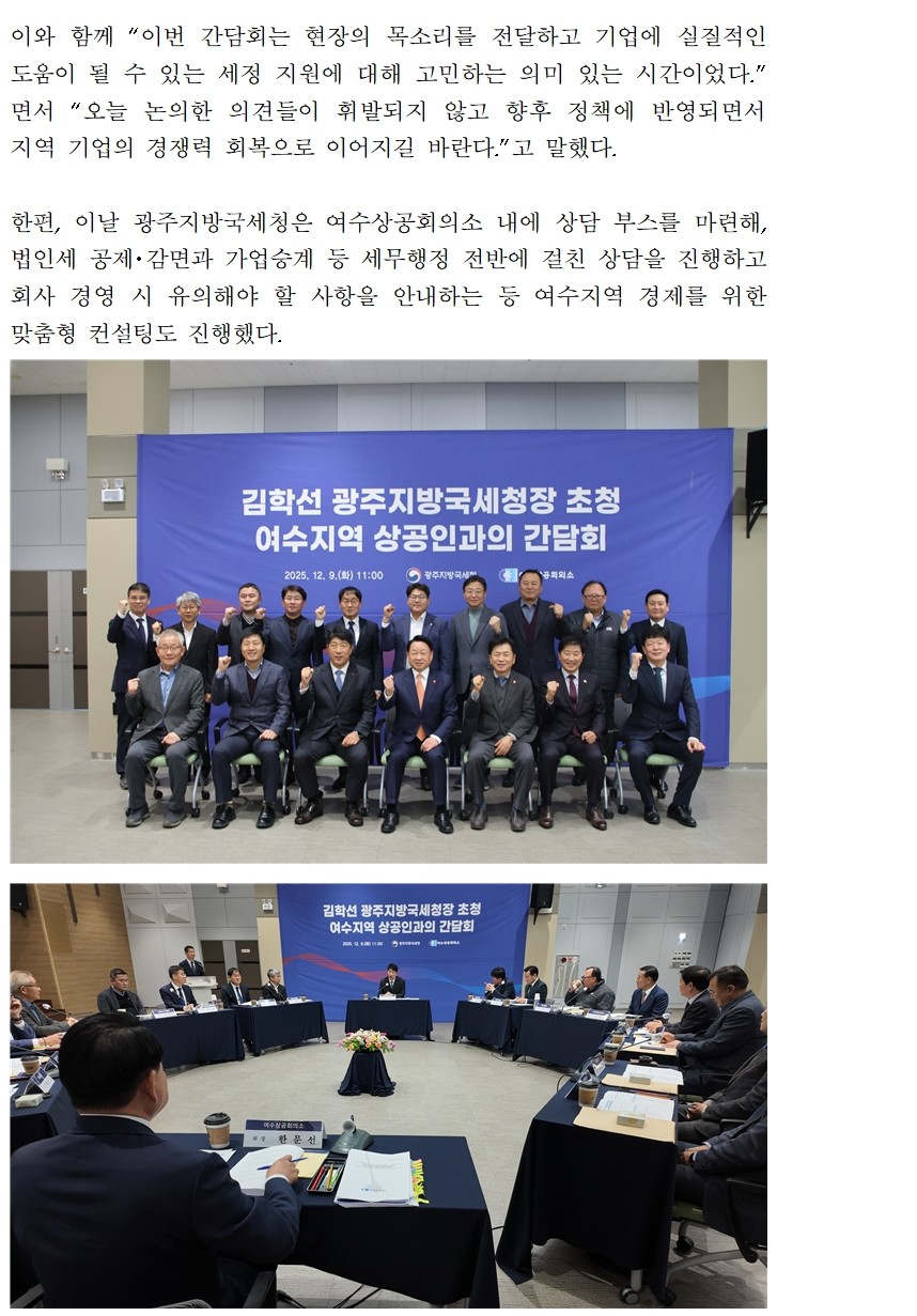 | 제목 | 여수상의, 김학선 광주지방국세청장 초청 여수지역 상공인과의 간담회 성료 | ||