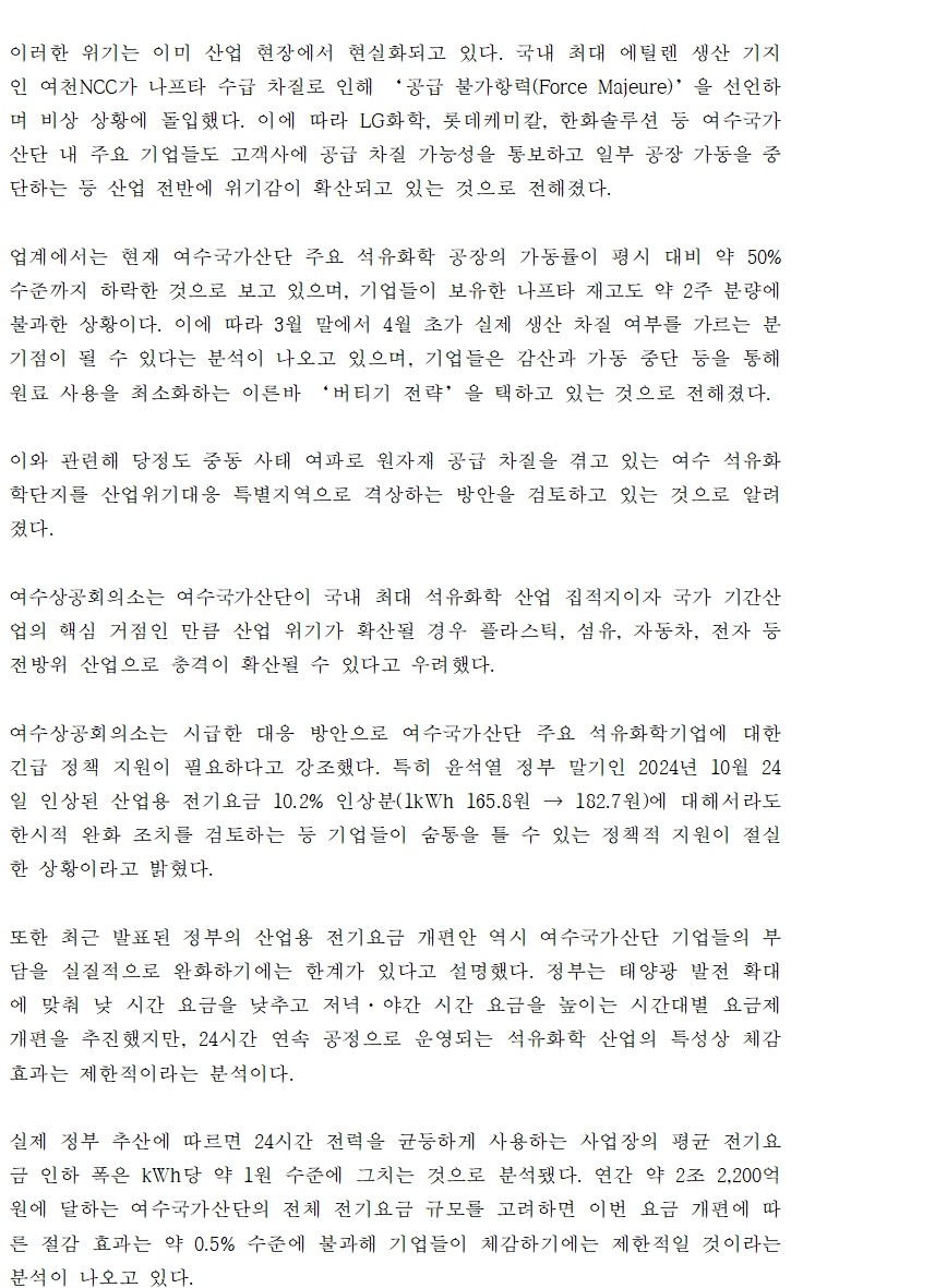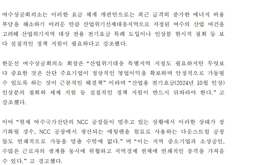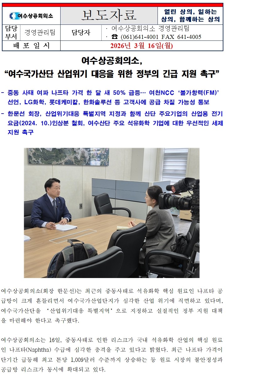 | 제목 | 여수상공회의소, 여수국가산단 산업위기 대응을 위한 정부 긴급 지원 촉구 | ||