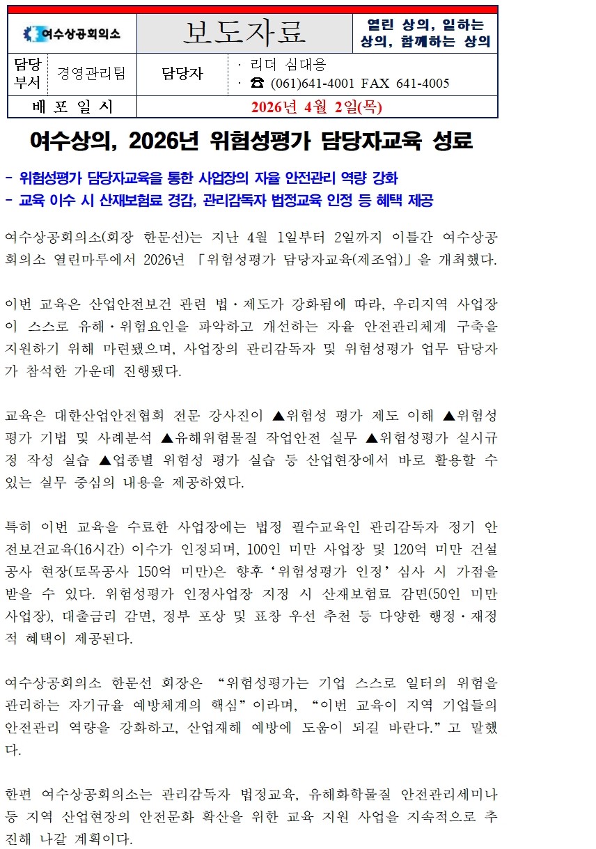 | ‒ | 여수상공회의소, 2026년 위험성평가 담당자교육 성료 |