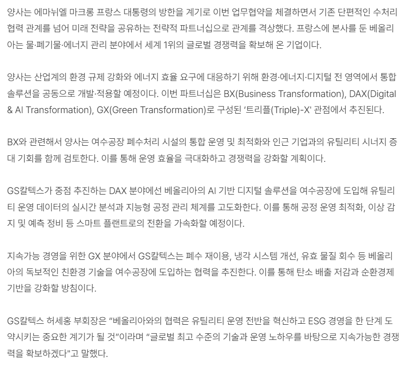 | ‒ | GS칼텍스, 세계 1위 글로벌 환경 솔루션 기업 '베올리아'와 전략적 파트너십 체결 |