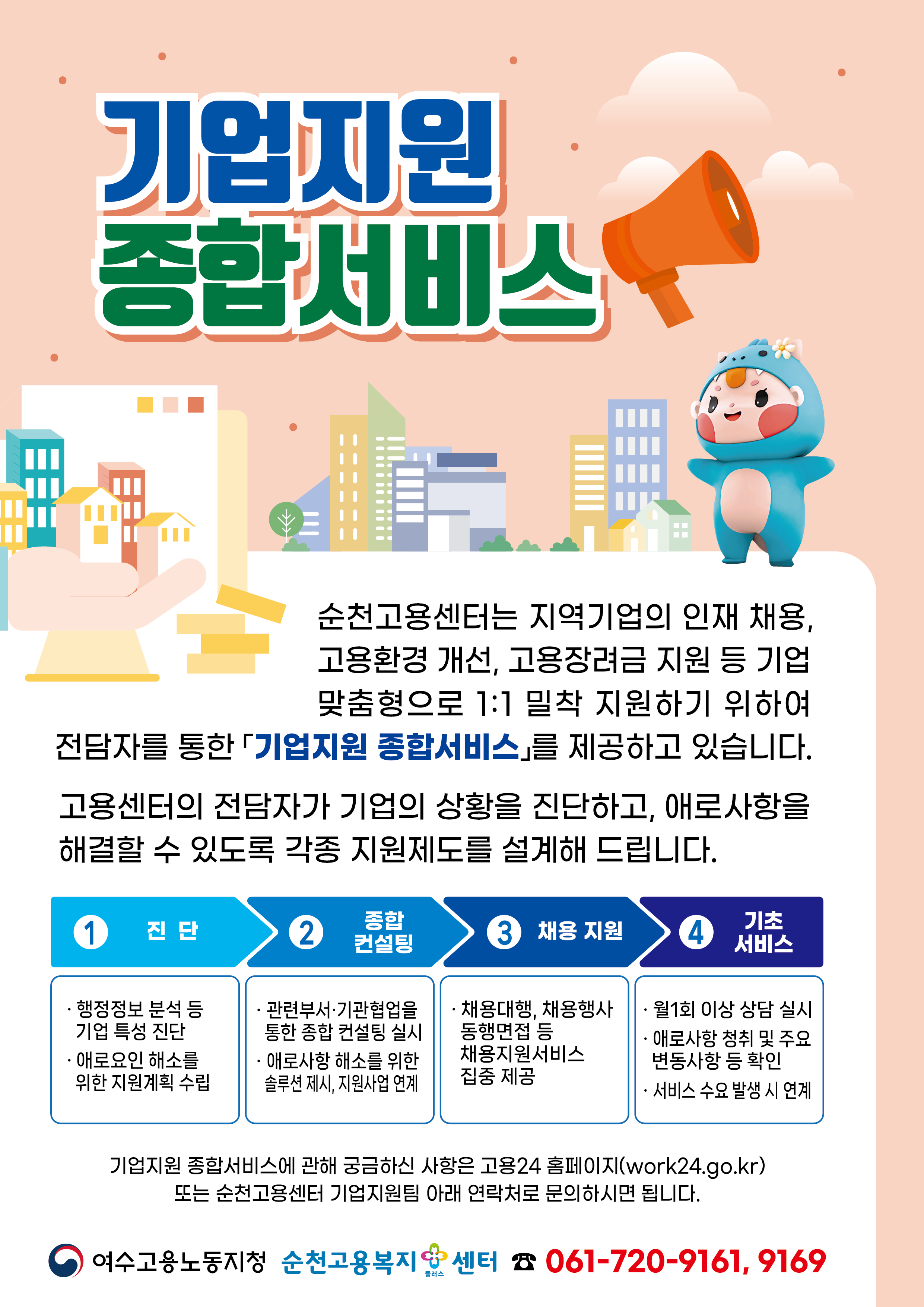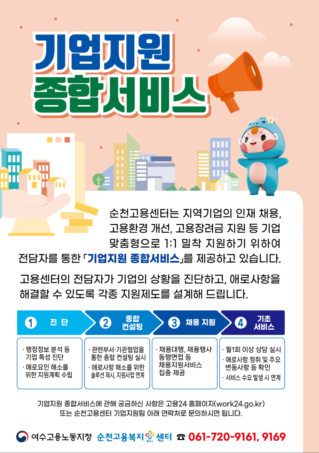 여수고용노동지청 순천고용센터는 지역기업의 인재 채용, 고용환경 개선, 고용장려금 지원 등 기업 맞춤형으로 1:1 밀착 지원하기 위하여 전담자를 통한 [기업지원 종합서비스]를 제공하고 있습니다.